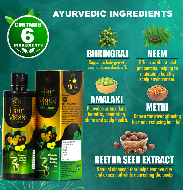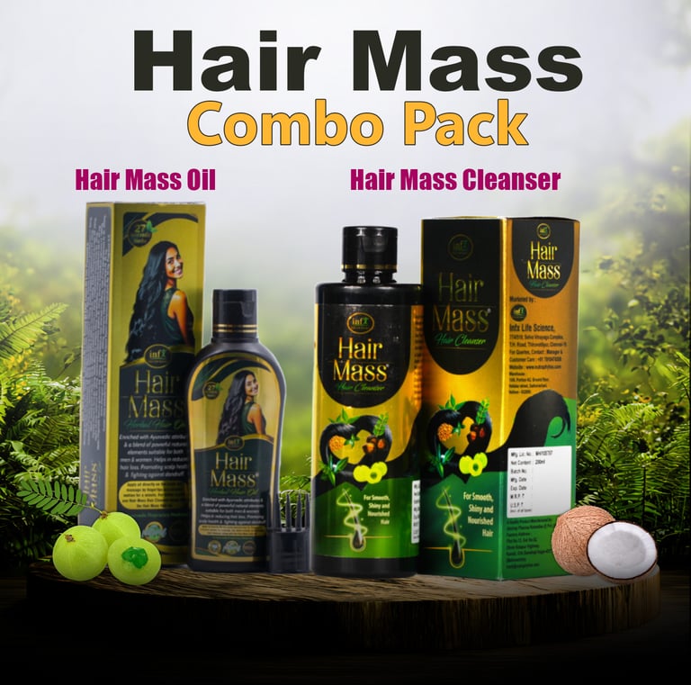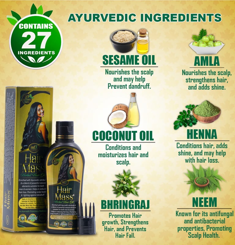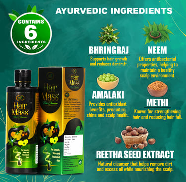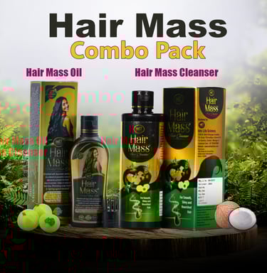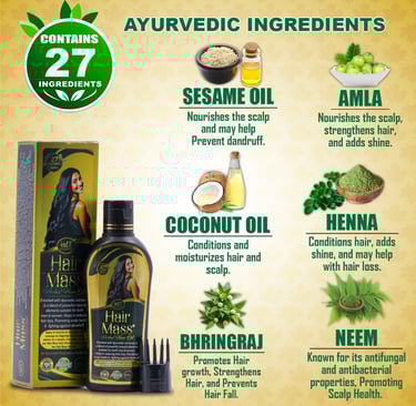 At Hair Mass, we embrace Ayurveda to restore hair wellness. Our herbal formulations, powered by 27 Ayurvedic Herbs [including Bhringraj, Neem, Amla, Methi, Triphala, Henna, Brahmi, Aloe Vera, Sesame Oil, Coconut Oil, and more] and Essential Nutrients [including Biotin, Keratin, Collagen, Amino Acids, and more], deeply cleanse, strengthen, and revitalize your hair. Designed for all hair types, they naturally reduce hair fall, promote growth, and ensure long-lasting scalp health.