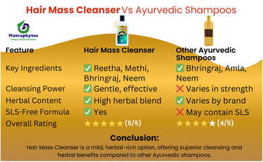 Hair Mass Cleanser stands out from other Ayurvedic shampoos with its high herbal content, including Reetha, Methi, Bhringraj, and Neem. It offers a gentle yet effective cleansing experience, is free from harsh SLS chemicals, and has a superior 5-star rating compared to competitors