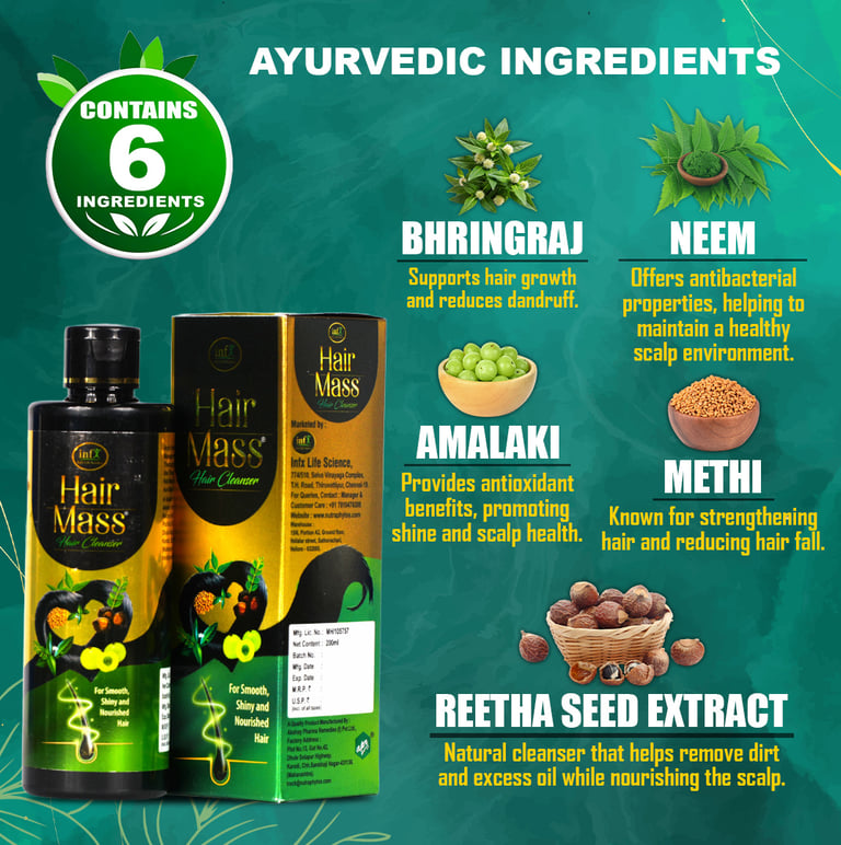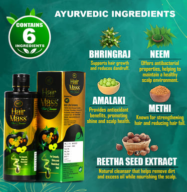 Hair Mass Cleanser is enriched with the power of six Ayurvedic herbs, including Bhringraj, Amla, Shikakai, Neem, Brahmi, and Aloe Vera. These natural ingredients work together to cleanse the scalp, strengthen hair roots, and promote healthy, shiny hair while reducing dandruff and hair fall.