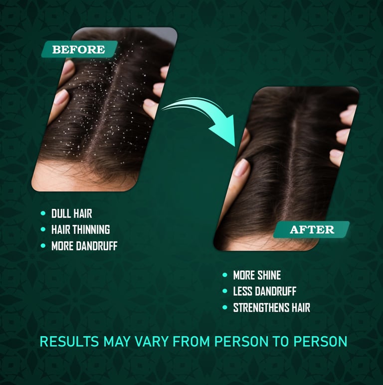 The before-and-after results of Hair Mass Cleanser show a significant transformation. Before use, hair appears dull, with noticeable dandruff and thinning. After regular use, the scalp looks healthier, dandruff is reduced, and hair becomes stronger, shinier, and more vibrant