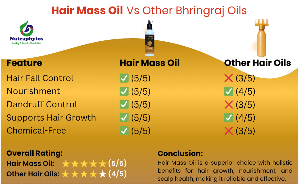 Hair Mass Oil as a superior choice over other Bhringraj oils, offering 5/5 ratings in key areas like hair fall control, nourishment, dandruff control, and chemical-free formulation. Unlike other oils, Hair Mass Oil provides complete scalp care with Ayurvedic ingredients, ensuring stronger, healthier hair growth.