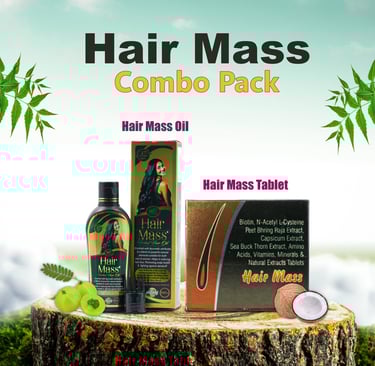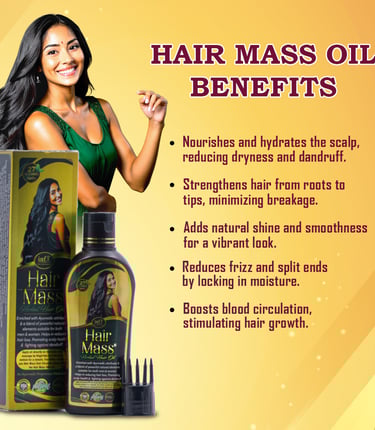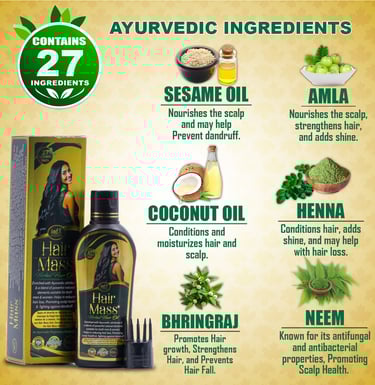 Hair Mass Oil is enriched with 27 powerful Ayurvedic herbs, including Bhringraj, Neem, Amla, Methi, Triphala, and Coconut Oil, that deeply nourish the scalp, strengthen hair roots, and reduce hair fall. This unique herbal blend promotes healthy hair growth, prevents dryness, and enhances natural shine, making hair stronger and more resilient with every use.