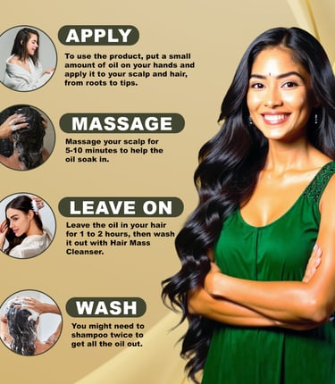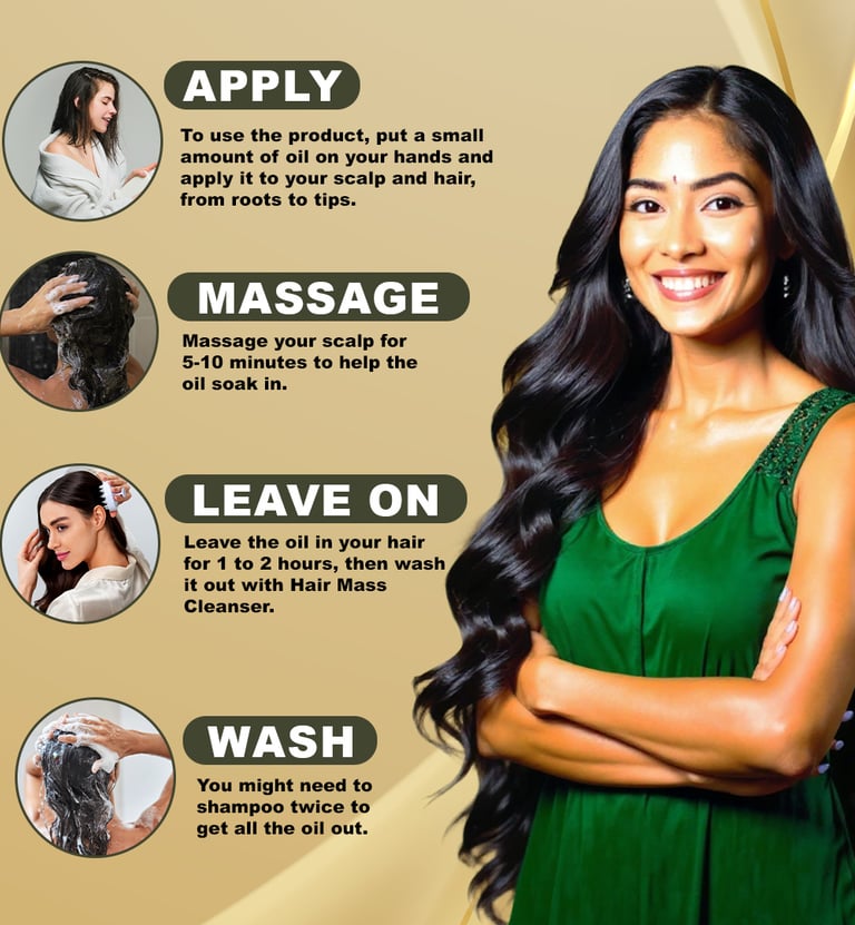 Apply a small amount of oil to your scalp and hair, starting from the roots to the tips. Massage gently for 5-10 minutes to enhance absorption. Leave it on for at least 30 minutes or overnight for deep nourishment. Wash thoroughly with Hair Mass Cleanser for best results!