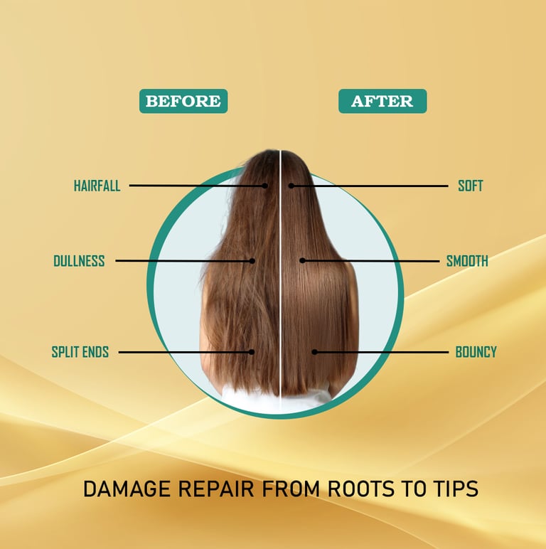 Experience the difference with Hair Mass Oil! The "Before" side shows common hair concerns like hair fall, dullness, and split ends. After regular use, hair becomes noticeably soft, smooth, and bouncy. Enriched with Ayurvedic ingredients, it nourishes from roots to tips, promoting healthier, shinier, and stronger hair.