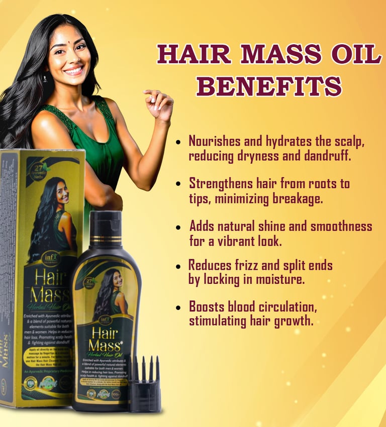 Hair Mass Oil deeply nourishes the scalp, strengthens hair roots, and helps reduce hair fall with the power of 27 Ayurvedic herbs. It promotes healthy hair growth, adds natural shine, and keeps the scalp hydrated, making hair smoother, thicker, and more resilient.
